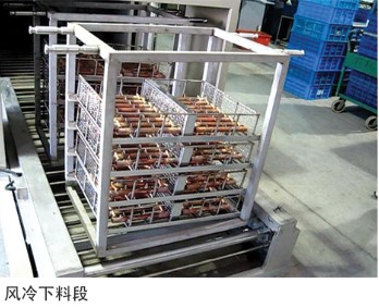 基本組成:由清洗段、過渡段、烘干爐段、風(fēng)冷下料段、上料小車、 吊籃及電器控制系統(tǒng)組成。